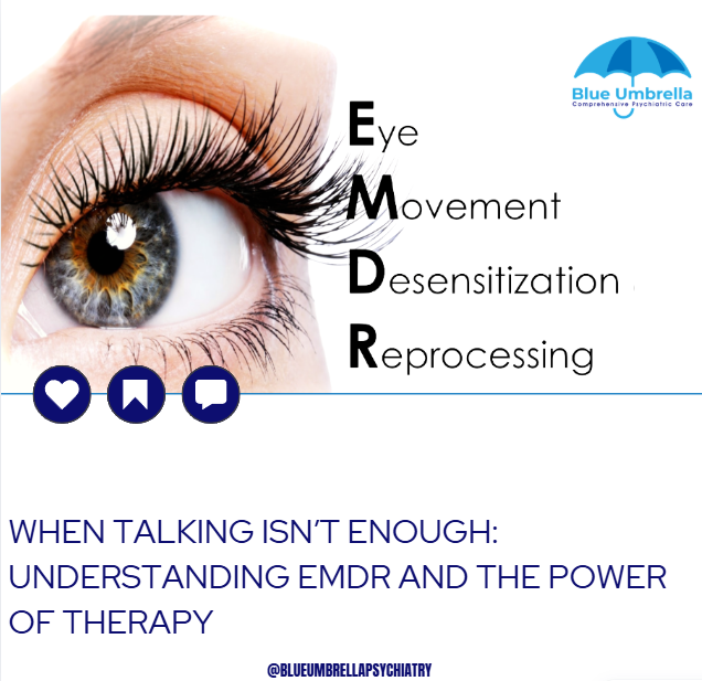 Blue Umbrella Psychiatry, we have six therapists with diverse specialties, availability, and insurance participation. Among them, we are proud to offer EMDR therapy for individuals seeking a focused, trauma-informed approach to healing.